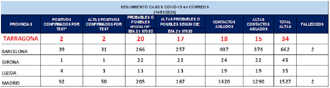 ÚLTIMES DADES DE LA COVID-19 FACILITADES PER CORREUS A DATA 14 DE SETEMBRE DE 2020