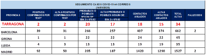ÚLTIMES DADES DE LA COVID-19 FACILITADES PER CORREUS A DATA 14 DE SETEMBRE DE 2020