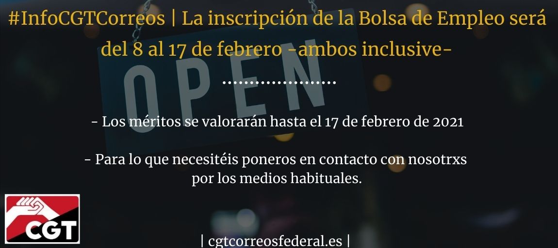 TERMINI D’INSCRIPCIÓ A LES BOSSES D’OCUPACIÓ DE CORREUS by CGT CORREUS TARRAGONA | febr. 8, 2021 | blog antiguo | 0 comments Enviar un Comentari Cancel·la les respostesL'adreça electrònica no es publicarà. Els camps necessaris estan marcats amb *Comentari * Nom * Correu electrònic * Lloc web Desa el meu nom, correu electrònic i lloc web en aquest navegador per a la pròxima vegada que comenti.